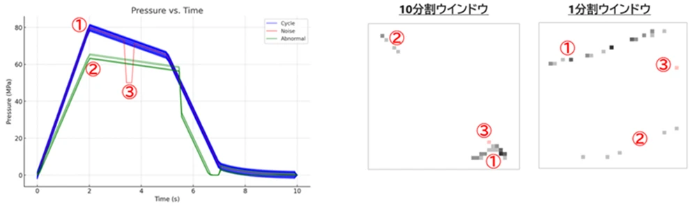 射出成型や鋳造工程のように、製品の成型までのサイクルが決まっている周期性を持つデータに対し、サイクルごとの特徴量※ を自動抽出し比較することが可能です。