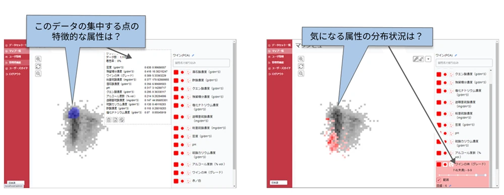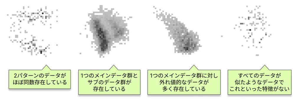 可視化を行いデータを俯瞰することにより、ひと目でデータの性質・構造が読み取れます。