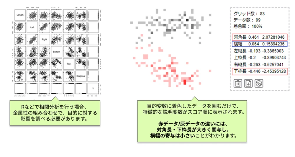 複数のマップ化ロジックに対応しています。目的変数の分布状況を最初から確認可能なので、そのデータに適切な分析アルゴリズムを容易に選択できます。