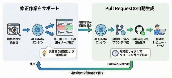 • 「検出 → 修正案作成 → Pull Request作成」という一連の流れを短時間で回せるため、リリースサイクルを乱さずにセキュリティ修正を組み込むことが可能です。