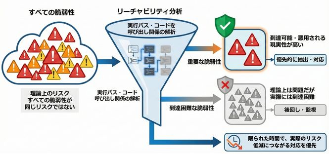 • すべての脆弱性が同じリスクを持つわけではなく、「実際に到達可能か」「悪用される現実性がどの程度あるか」が重要です。