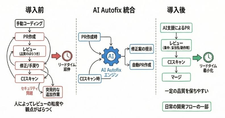 • AI Autofixが作成した修正案やPull Requestをベースにレビューすることで、レビュアーは「修正方針の妥当性」や「副作用の有無」に集中できます。