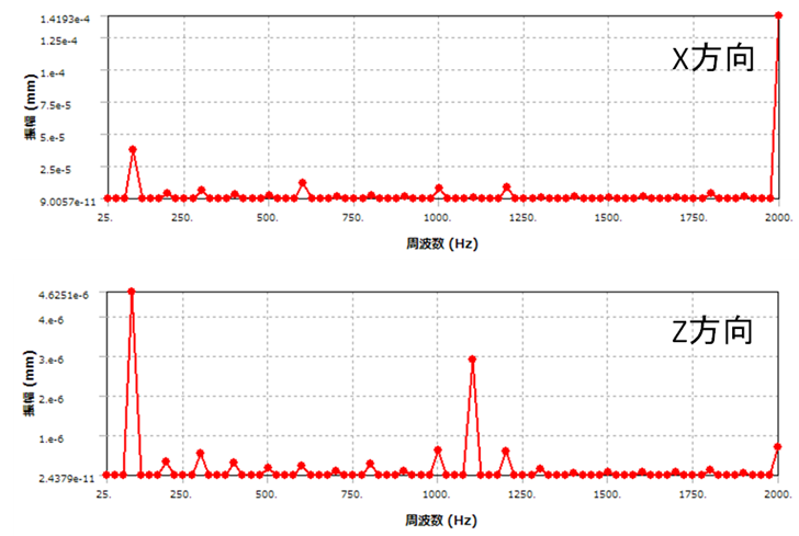 100Hz、1100Hzおよび2000Hzで特に大きな振幅が生じていることが確認できます。