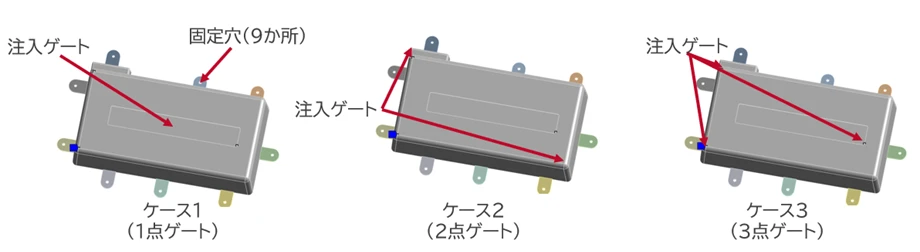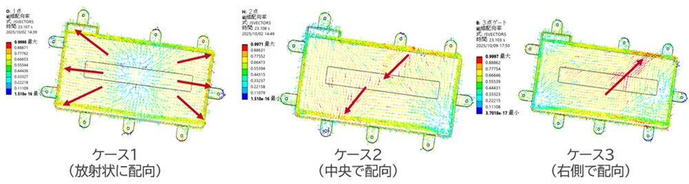 繊維配向解析の結果を示します。図中に矢印で示したように、1点ゲートでは繊維が放射状に配向するのに対して、2点、3点ゲートでは流動の合流部(ウェルドになりうる部分)の付近で繊維が配向することが確認できます。
