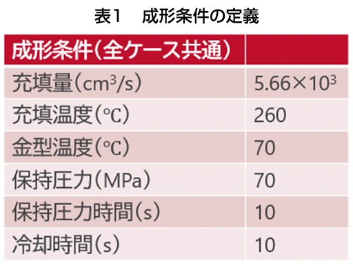 成形条件を表1に示します。この条件は全ケースで共通とします。ケース2(2点ゲート)の場合には、それぞれの注入点で設定する充填量は、総充填量の1/2とします。同様に、ケース3(3点ゲート)の場合には、それぞれの注入点で設定する充填量は、総充填量の1/3とします。