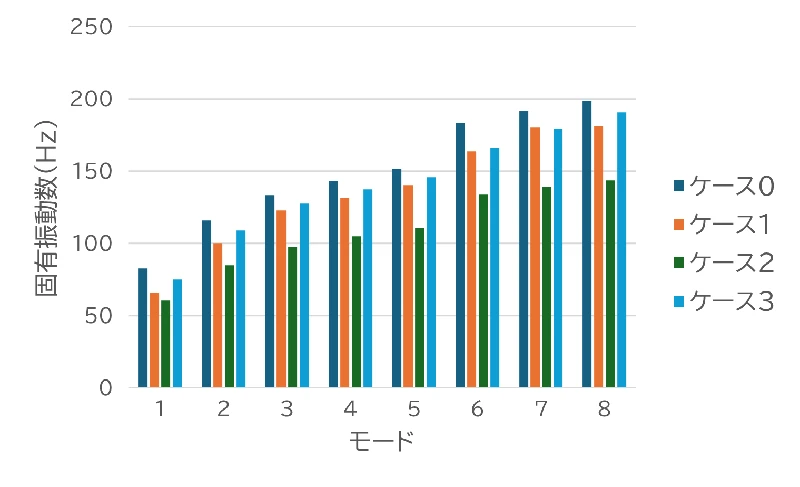 各ケースにおける1次モードから8次モードまでの固有振動数を図4に示します。成形履歴を考慮しない場合(ケース0)に比べて、成形履歴を考慮した場合(ケース1~3)には、いずれのモードでも固有振動数が低くなっています。