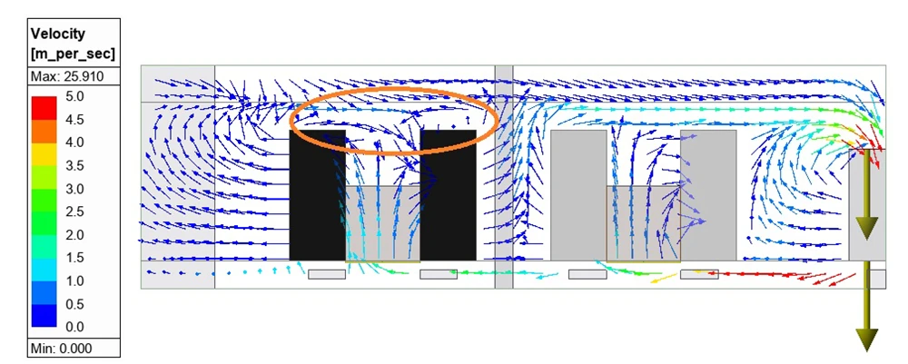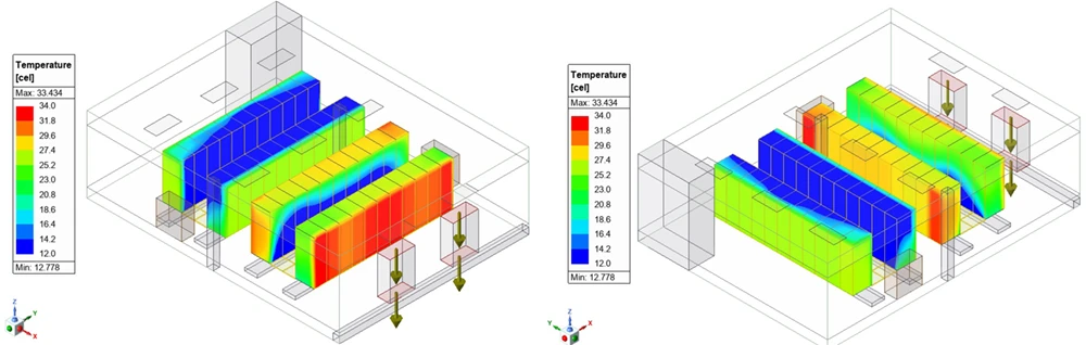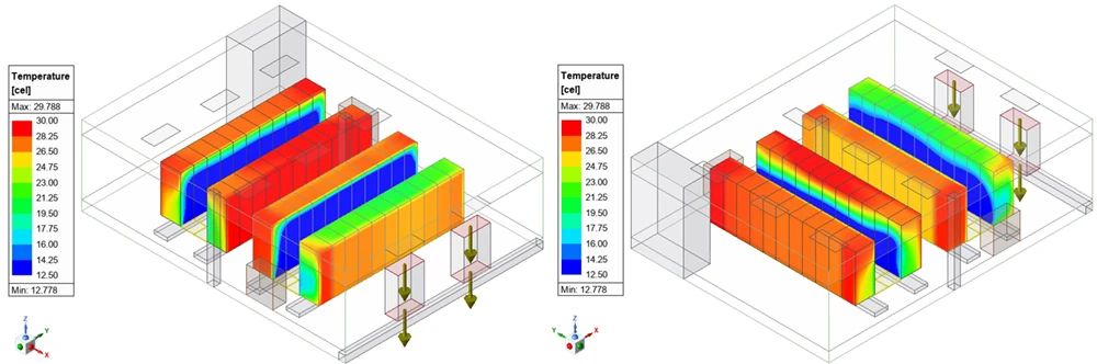本解析では解析空間をデータセンターの大きさとして、空調とPDU(Power Distribution Unit)を2か所設置したモデルの空調評価を行います。下記のように床下、天井への排気口とラックをモデル化しています。PDUとHD ラック、ラック内で発熱が生じている状況に対して空調評価を行います。空調システムは12℃で設定しています。