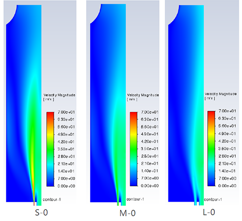 - 外側ノズルの流速が最も速いS-0において反応領域付近の速度が最も大きく,次いでM-0,L-0となる