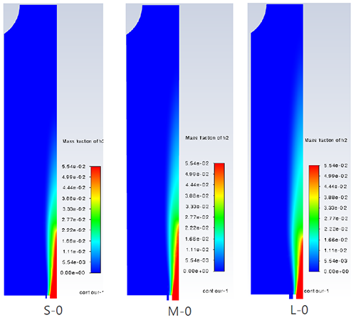 - 質量分率分布の軸方向長さから,S-0,M-0,L-0の順で水素が消費されるタイミングが早いことがわかる
