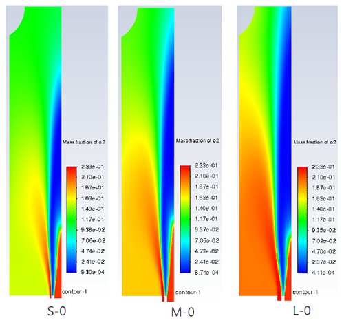 - S-0,M-0,L-0の順で中心部分の低酸素領域が下流まで残留していることがわかる