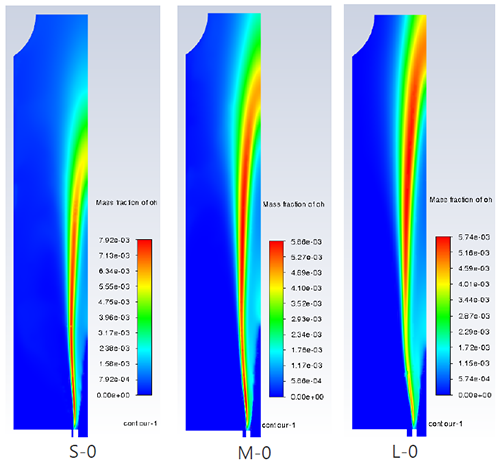 - S→M→Lの順に火炎が長くなり(OH高領域が伸び・太くなる)、水素消費のタイミングも変化