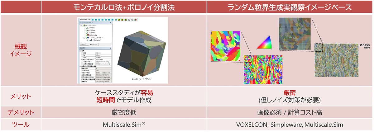 結晶粒のモデリングには、モンテカルロ法+ボロノイ分割法によるランダム粒界生成実観察イメージベースのモデリングの2つの手法があり、解析目的に応じた選択が可能です。これにより、粒界構造や欠陥の影響を組み込んだ現実的な解析が行えます。