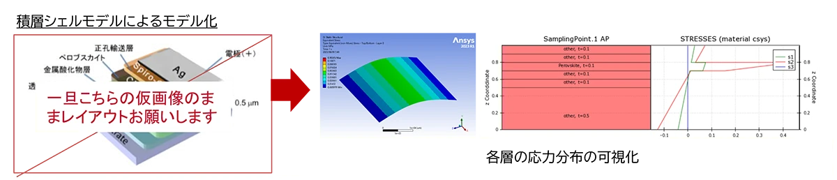 各層の応力分布や破壊領域の可視化が必要です。薄膜を多数積層した複雑な構造を効率的にモデル化および解析しつつ、各層の応答を詳細に評価するための技術が求められます。
