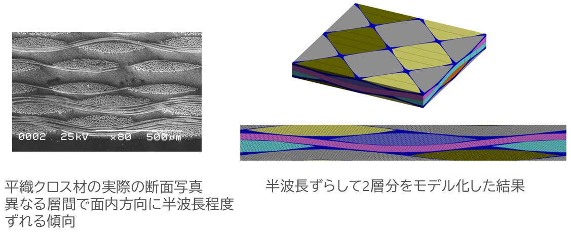 隣合う層間で互い違いに繊維が配置した平織クロスモデルが作成できるようになりました。繊維含有率の高い平織クロス材では、そのようなミクロ構造になっていることが多いため、特におおよそ35%を超える程度の高い繊維含有率の材料では精度の改善が期待できます。