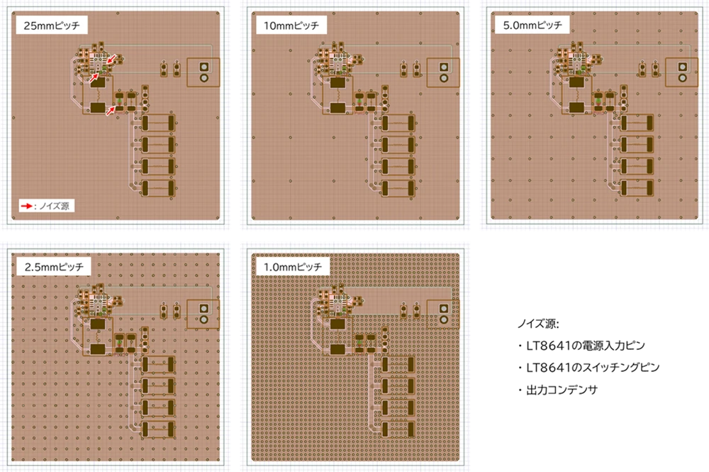 一方で、「ビアは多すぎても良くない」という意見が正しければ、ビア数の多い2.5mmピッチや1.0mmピッチの基板で放射ノイズが増える可能性も考えられます。