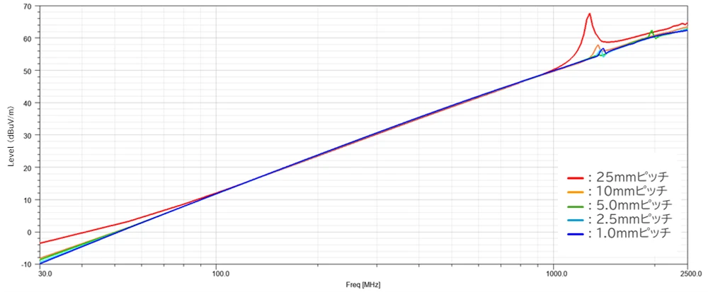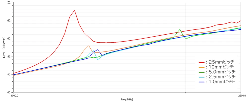 今回解析を実施した周波数範囲では、2.5mmピッチが「ノイズ波長の1/20以下」という一般的な指標を満たす設計となりますが、解析結果からは5~10mmピッチ程度でも十分な抑制効果が得られていることが確認できました。