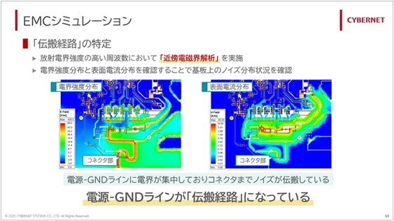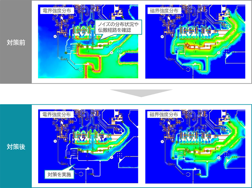 こちらの例では、放射エミッション試験が不合格であった基板のモデルを使用し、EMCシミュレーションによってノイズ源および伝搬経路を特定し、対策案の検討まで実施させていただきました。