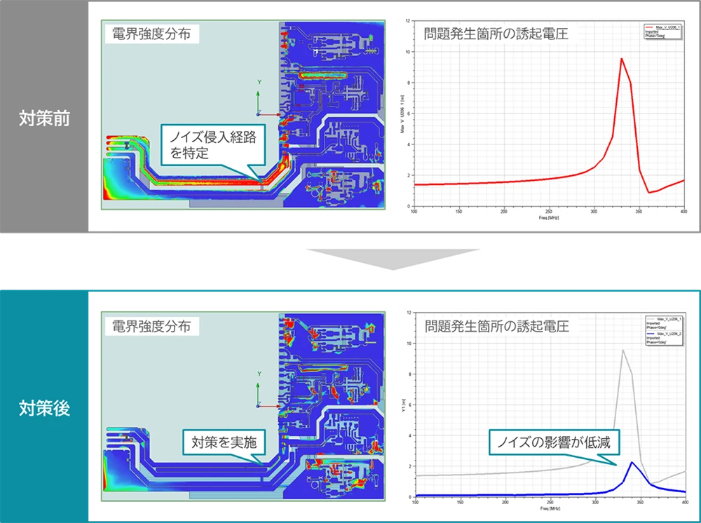 こちらの例では、放射イミュニティ試験が不合格であった基板のモデルを使用し、EMCシミュレーションによってノイズの侵入経路、伝搬経路、不具合箇所を特定し、対策案の検討まで実施させていただきました。