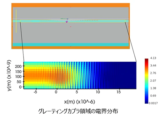 グレーティングカプラの設計では、入射光はファイバモードとなるため、モード分布を考慮する必要があります。そのため、アポダイゼーション(回折格子の特性を局所的に変調させ、実効屈折率分布とモード分布を整合させる方法)が用いられますが、この調整には多数の設計パラメータが関わり、複雑になります。