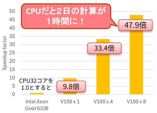- GPU を活用することで、CPU の数十倍に及ぶ計算速度を実現し、大規模モデルから小規模モデルまで安定して高速化を達成しました。これにより、従来 CPU で 2 日かかっていた計算を 1 時間程度に短縮可能となり、パラメータスイープや最適化を効率的に実施できます。