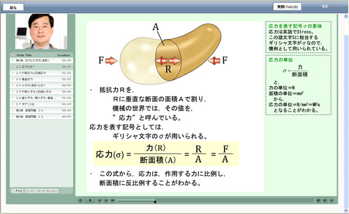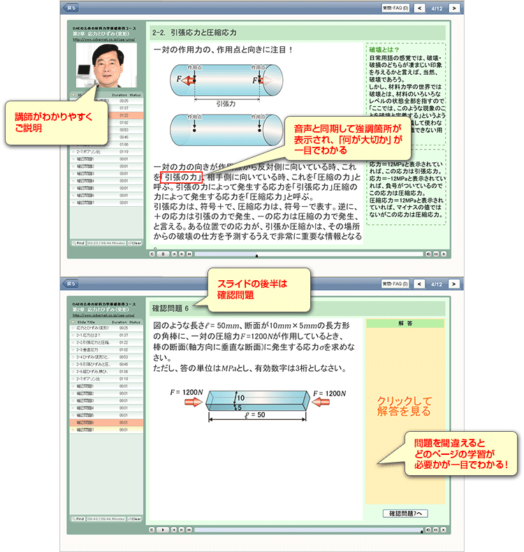 コース内容は8章立てでレベルチェックもあり、CAEを活用する際にぜひ知っておきたい材料力学の知識を確認します。また、セミナー部分では音声と同期してスライド上で強調箇所が表示され「何が大切か」がわかりやすくなっています。また、スライドの後半箇所は確認問題となっていて、問題を間違えた場合にはどのページの学習が必要かがわかるようにリンクがついています。
