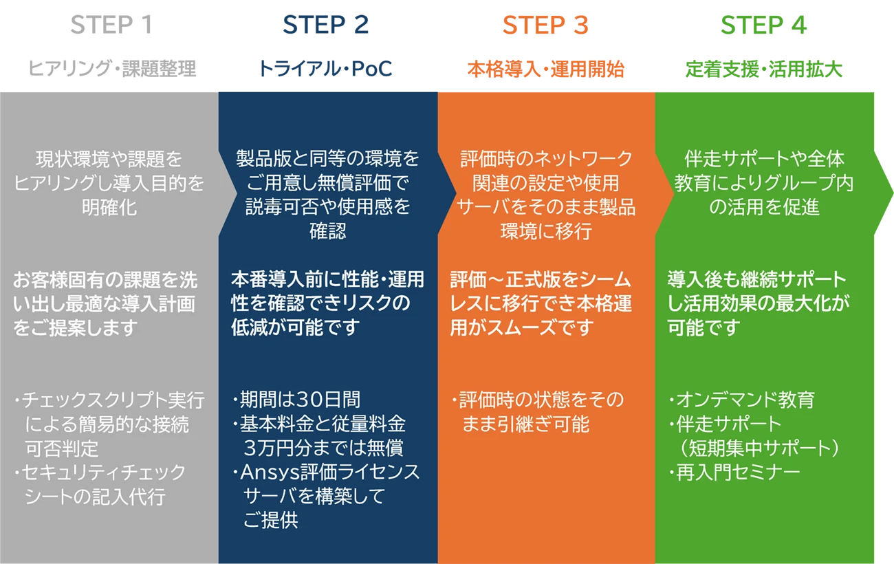 サイバネットCAEクラウドは、お客様の課題整理から本格運用、定着までを伴走支援します。