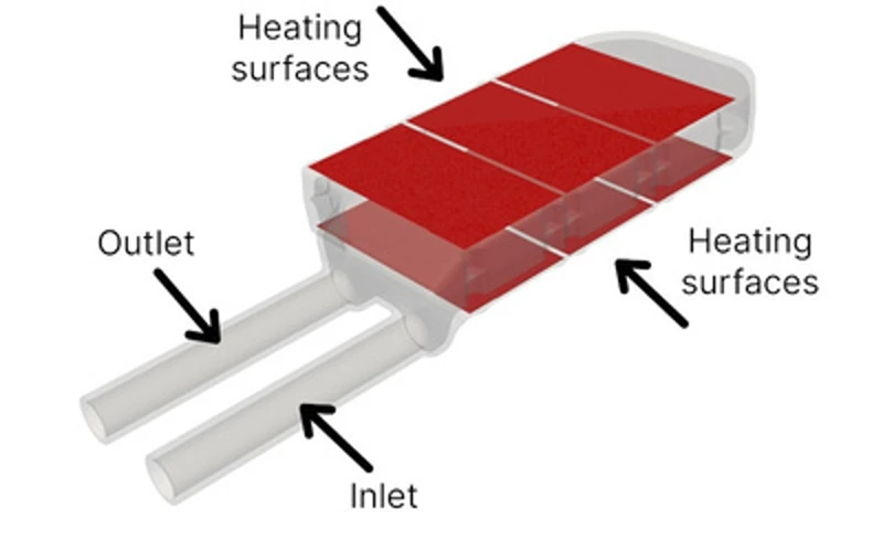 インバータの運転条件は、ColdStreamにおける設計生成の入力条件となります。熱源は電気部品であり、図1に示すように、冷却チャネルの上面および下面を含む3つの表面において、それぞれ667 Wの発熱量が与えられます。冷却媒体は水で、流量は9.5 L/minであり、図には入口および出口の位置も示されています。