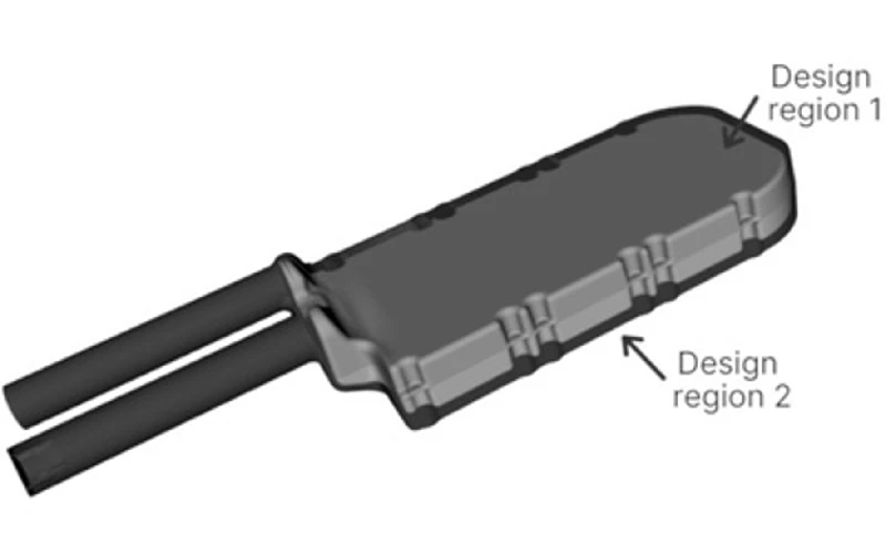 本冷却システムでは、図2に示すように2つの設計領域が定義されています。各設計領域において、ColdStreamは最適なトポロジーを生成することが許可されています。設計領域の定義には製造方法の指定が必要であり、本ケースではCNC加工が採用されています。インバータ冷却システムの材料にはアルミニウムが用いられています。