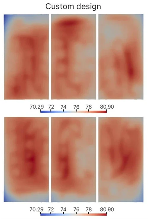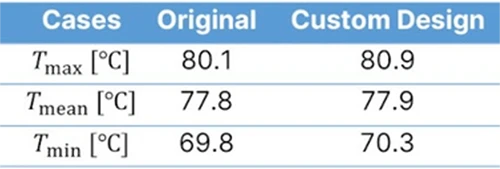 ColdStreamによる設計は、GLMの従来の冷却チャネルと比較され、その改善効果が評価されています。表1には、各設計における熱源の最大温度、平均温度、および最小温度が示されています。図4、5、6に示すように、ColdStreamは同等の温度レベルを維持しながら、より優れた温度分布を実現しています。カスタムデザインでは、温度ばらつきの97.4%が6℃以内に収まっています。