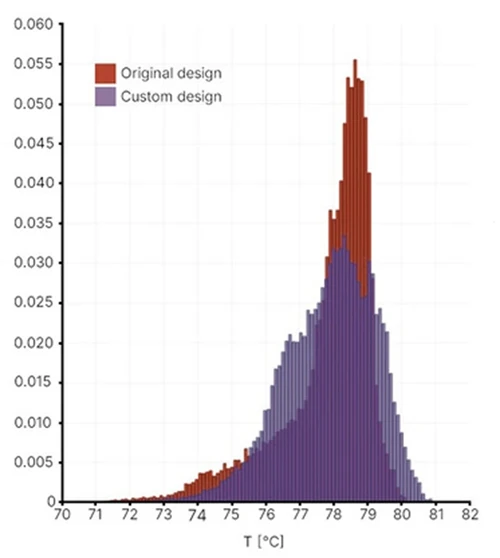 図4:従来のGLM設計およびジェネレーティブデザインにおける温度分布の頻度