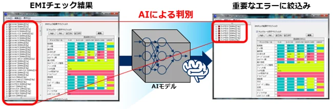 EMC設計熟練者のデザインレビュー判断をAI化しており、AIによってEMIチェック結果を優先度の高い重要なエラーに絞り込みます。これによりEMIルールチェック結果の判別を勘や経験に頼らず、同じ判断基準で絞込み、設計品質のバラつきを低減します。また、利用者の育成や引き継ぎの負荷を軽減します。