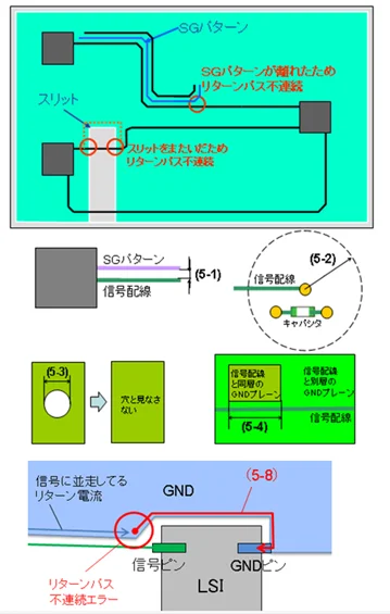 片面/両面基板でEMIの問題となるLSIを含む信号経路のリターンパスやでデカップリングキャパシタの電流ループ経路を可視化し、ノイズの発生/拡散を抑えるPCBレイアウト設計を支援します。