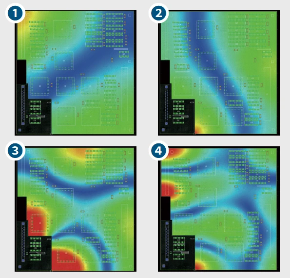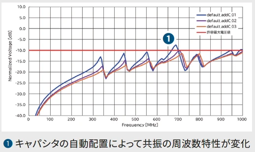 共振を抑える位置に自動でキャパシタを配置することができるので、EMI対策に慣れていない場合でも素早く効率的に共振対策を実施することができます。