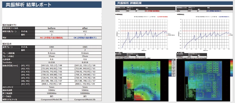 EMIルールチェックと同様に、周波数表示や電圧分布表示などの共振解析結果を、Excel 形式のレポートファイルとして自動出力することができます。
