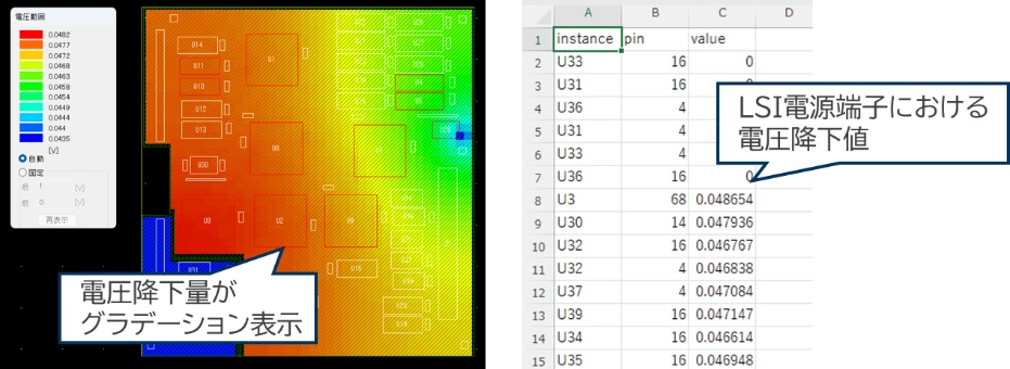 電流分布をもとに、LSIなどの電流消費ポイントにおける電源電圧の降下量を算出し、設計電圧が十分に供給されているかを確認できます。