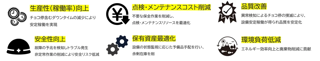 ダウンタイムの削減により生産性が上がる・メンテナンスコストが最適化できるというのはもちろん、突発トラブル対応の削減=非定常作業の削減となり、作業員の安全リスクの低減にもつながります。また、安定稼働による品質の安定や、環境保全への貢献も実現できるでしょう。