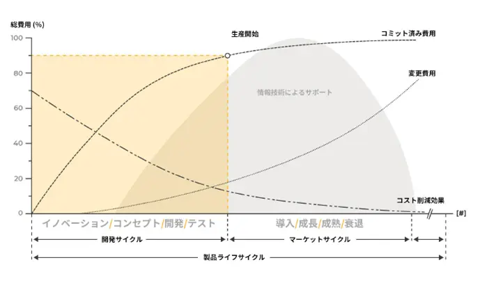 製品販売原価の削減を意識する経営者にとって重要なポイントは、黄色のボックスの右上隅、生産開始直前に「コミットされた費用」が90%まで上昇するポイントです。