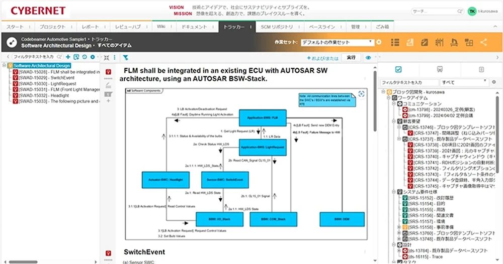 - 要件管理:ASPICEやISO26262などの規制要件に準拠しながら、開発要件を管理