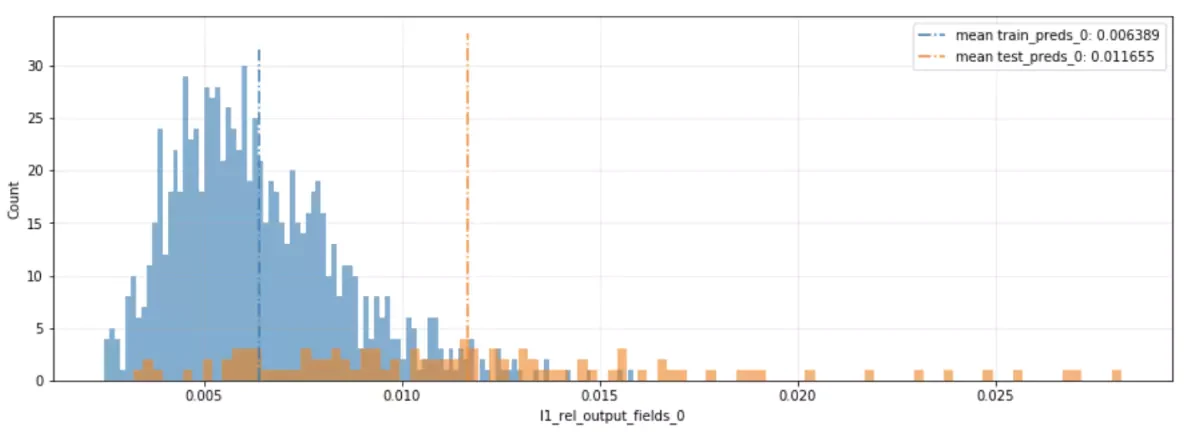 誤差の分布を以下に示します(L1相対値を基準指標として選択)。ほとんどのサンプルでL1相対誤差が0.5%から1.5%の範囲に収まっていることが分かります。予想通り、学習済セット(train:青)ではパフォーマンスが向上しています。