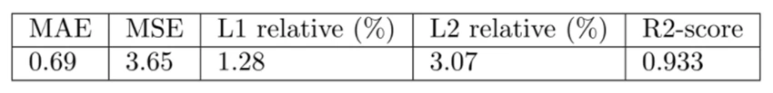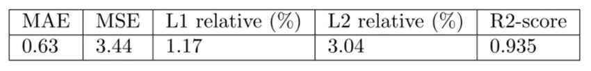 一方、学習サンプル 200 件の場合、学習過程で過学習(overfitting)が発生し、性能はやや低下します。それでも、相対 L1 誤差は 1.56%、テストセットの R2Rスコアは 0.880であり、許容範囲内に収まっています。ただし、上記のようなより多い学習サンプルがある時に比べると、汎化能力に優れてはいません。