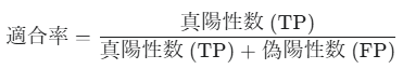 適合率とは、モデルが「陽性」と予測したもののうち、実際に陽性であった割合を指します。不要なものを誤って陽性と判断してしまわないかというモデルの正確性を表します。