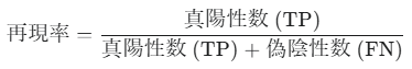 ここで、FN(False Negative)は実際は陽性だが、モデルが陰性と誤って予測してしまった数を表します。