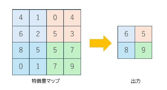 畳込みニューラルネットワーク(CNN)ではこの操作を行う層はプーリング層と呼ばれ、通常、畳込み層(Convolution Layer)の後に接続されます。