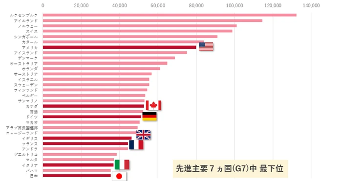 さらに一人当たりGDPを見ると、日本はG7の中でも最下位で、アメリカの半分程度に留まっている状況です。