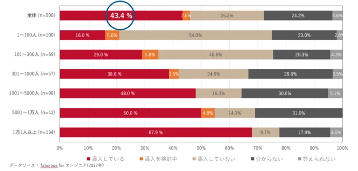 日本の製造業500社の調査では、CAE導入率は43.4%であり、企業規模が大きいほど導入率が高い傾向があります。