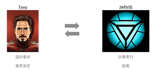 『アイアンマン』では、トニー・スタークがAIアシスタントのJARVISを使い、シミュレーションを回して答えを得ながら開発を進めます。トニーは自分で計算やプログラミングをせず、JARVISの結果をもとにYES/NOの判断をします。つまり、トニーは考えることに集中できるのです。