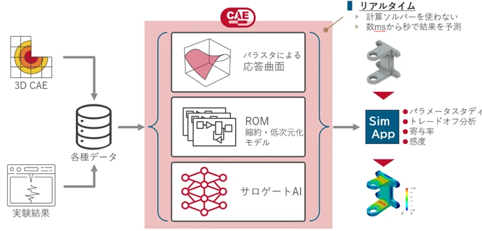 ここで鍵となるのがカプセルCAEです。カプセルCAEは、3D CAEや実験結果から生成された応答曲面、縮退モデル、サロゲートAIなどを用いた“結果予測ツール”です。