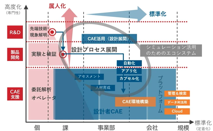 そして設計部門としては、CAEに関わる役割を明確にし、CAEの高度化と標準化を両輪で伸ばしていくことで、ものづくりDXを実現していくことが求められます。