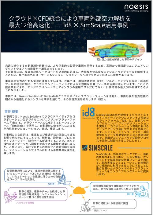 本資料では、Noesisのクラウド型エンジニアリングプラットフォーム「id8」と、クラウドCAEツール「SimScale」を活用した自動車空力設計の最適化事例を紹介します。車両外部空力解析において、設計・解析・研究・マネジメントといった複数部門が連携しながら、シミュレーションの高速化と効率化をどのように実現したのかを解説。クラウド環境を活用することで、従来の設計プロセスにおける課題を解消し、開発スピードと精度を両立した取り組みを具体的に紹介しています。