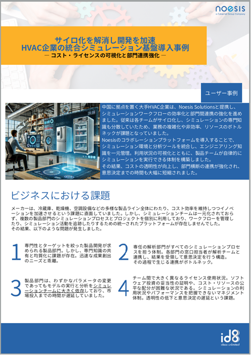 本資料では、中国の大手HVAC企業における統合シミュレーション基盤の導入事例をご紹介します。部門ごとに分断されたシミュレーション環境や、属人化した専門知識によって生じていた非効率や意思決定の遅延といった課題に対し、Noesisのコラボレーションプラットフォームを活用してどのように解決したのかを解説。開発プロセスの最適化と組織全体の連携強化を実現した取り組みを具体的にご覧いただけます。